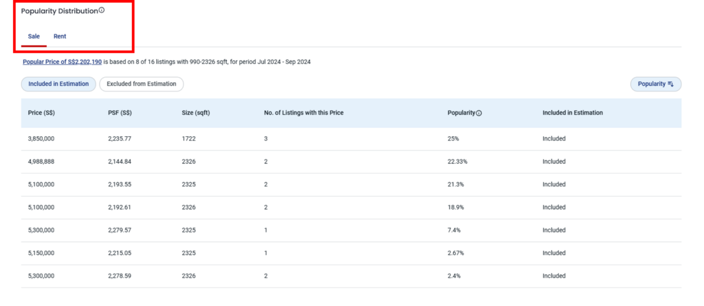 6. To dive deeper, click on “View Popularity Distribution” under the sale or rent tiles where you will be shown the listings used to analyse this price.