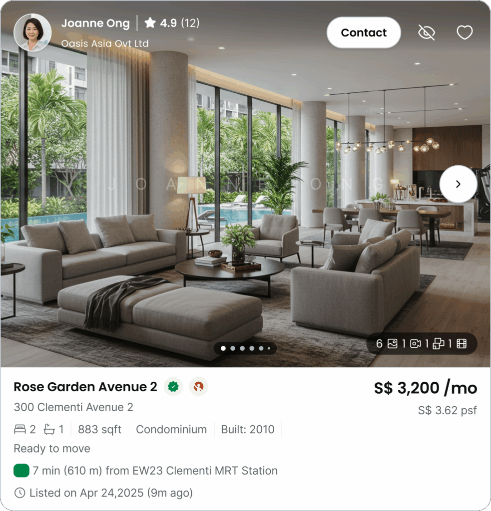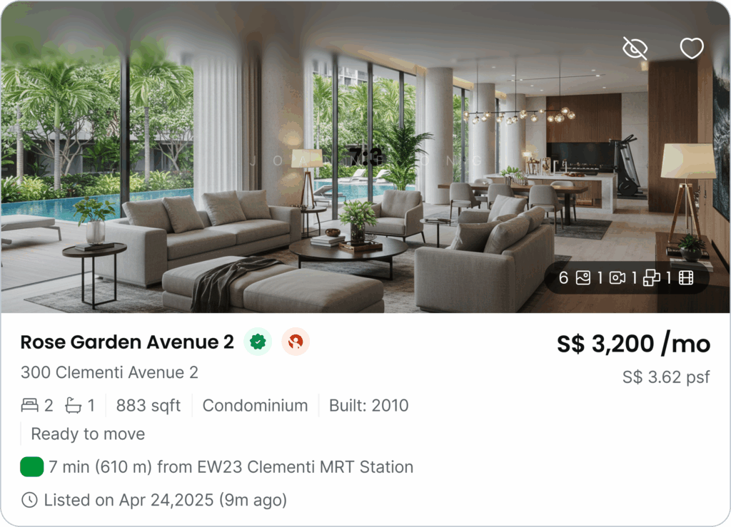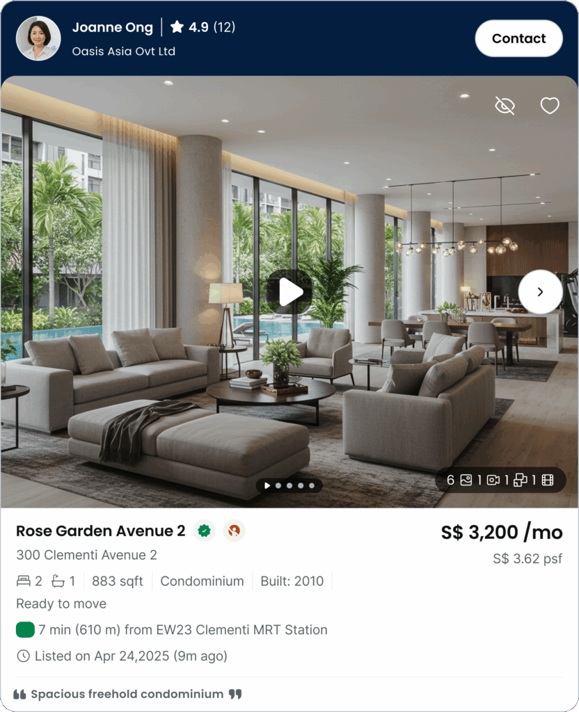 Largest card size featuring: Listing key details, listing headline, your name, your photo, your agency name & branding, ratings & reviews, carousel image, slideshow, cover video, contact button ![]() Joanne Ong ★ 5 (12) ![]() < > Rose Garden Avenue 2 300 Clementi Avenue 2 🛏 2 🛁 1 885 sqft Hdb Flat Built: 2009 ✅ Ready to move 🚶 7 min (620 m) from EW23 Clementi MRT Station 📅 Listed on Aug 05, 2025 (2m ago) S$ 3,200 /mo (S$ 3.63 psf) |