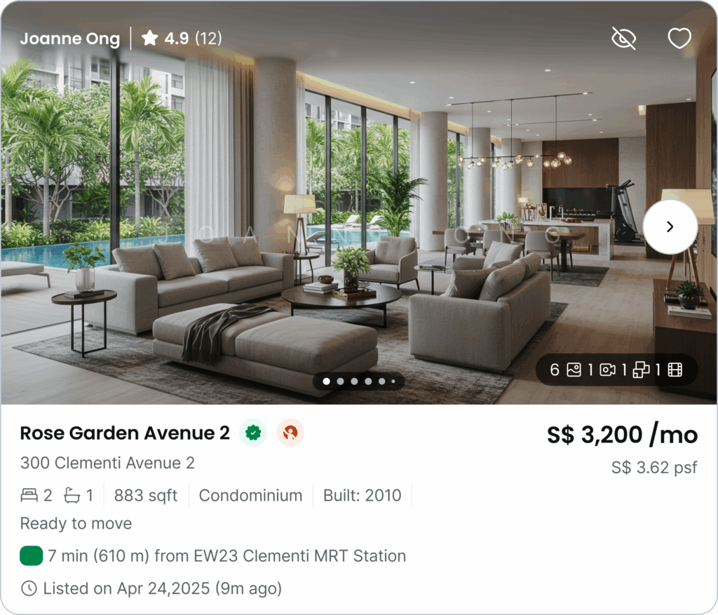 Medium card size featuring: Listing key details, your name, ratings & reviews, carousel image ![]() Joanne Ong ★ 5 (12) ![]() < > Rose Garden Avenue 2 300 Clementi Avenue 2 🛏 2 🛁 1 885 sqft Hdb Flat Built: 2009 ✅ Ready to move 🚶 7 min (620 m) from EW23 Clementi MRT Station 📅 Listed on Aug 05, 2025 (2m ago) S$ 3,200 /mo (S$ 3.63 psf) | Premium Listing card ×