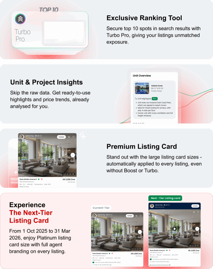 From 1 October 2025, we’re introducing redesigned packages, along with a pricing update to better support how agents grow today. These enhancements are built to help you win with credibility, reach, and speed on Singapore’s largest and most trusted property marketplace. Alongside new tools, each package now includes tiered access to:
